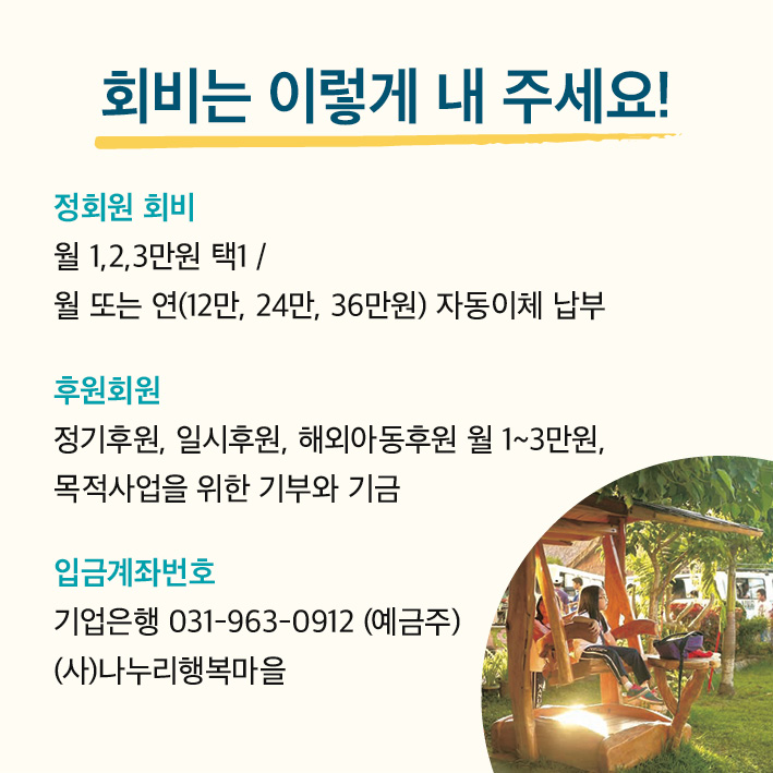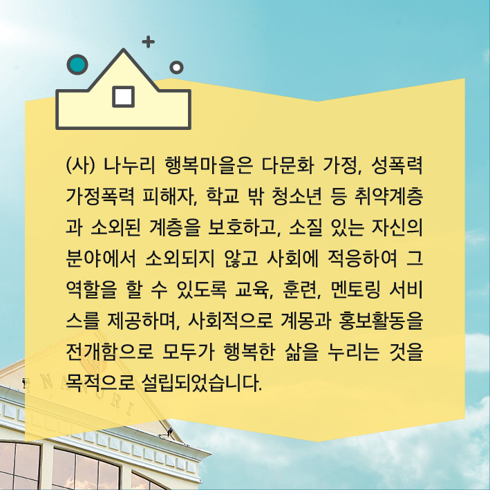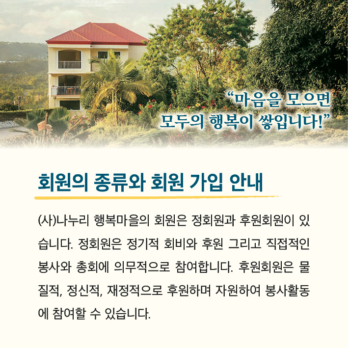 (사) 나누리 행복마을은 함께 나눔으로 행복한 세상을 열어가는 따뜻한 마음을 찾고 있습니다.